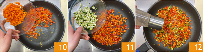 Añade la zanahoria 10 y cocina durante 2 minutos. Añade el calabacín 11 y ajusta de sal y pimienta 12. Continúa la cocción de las verduras durante otros 5-6 minutos.
