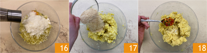 Una vez que las patatas estén cocidas, aplástalas en un bol 13 y deja que se enfríen un poco. Añade entonces los huevos 14 y el queso rallado 15.