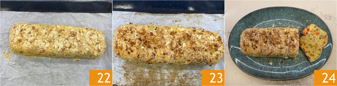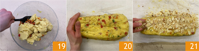 Mezcla para amalgamar los ingredientes 19. Coloca la mezcla sobre papel de horno y dale la forma de un paralelepípedo 20. Espolvorea la parte superior y los lados con pan rallado grueso y las almendras en láminas 21.