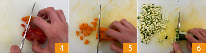 Redúcelos a cubos de 0,5 cm 4, haz lo mismo con las zanahorias 5 y los calabacines 6.