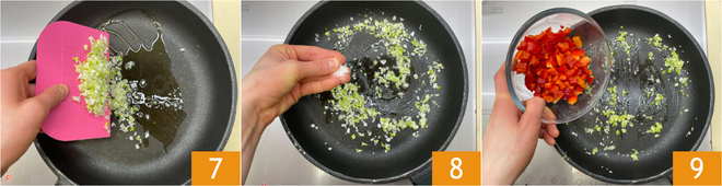 En una sartén vierte un chorrito de aceite, añade el cebollino 7 y ajusta de sal 8. Saltea a fuego medio-bajo durante aproximadamente 6 minutos. Añade el pimiento 9, sube el fuego y cocina durante 5 minutos.