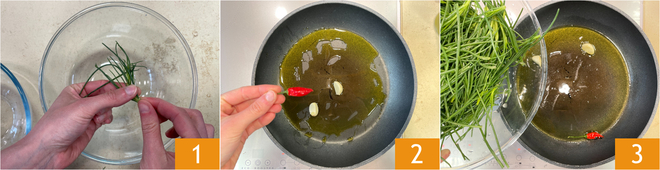 Para preparar las albóndigas con agretti, lo primero que debéis hacer es dedicaros a la Cómo limpiar y cocinar los agretti: eliminad la base con las raíces 1 y sumergidlos en un bol con agua y una cucharada de bicarbonato. Cambiad el agua 1-2 veces hasta que esté limpia. En una sartén verted un poco de aceite, los dientes de ajo con piel y la guindilla 2. Sofreíd brevemente, luego añadid los agretti 3.