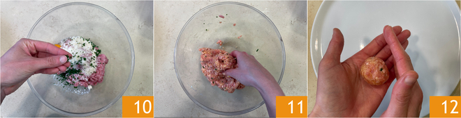 Aromatizad con el cebollino 10 y amasad hasta obtener una mezcla homogénea 11. En este punto, formad las albóndigas con las manos ligeramente humedecidas 12.