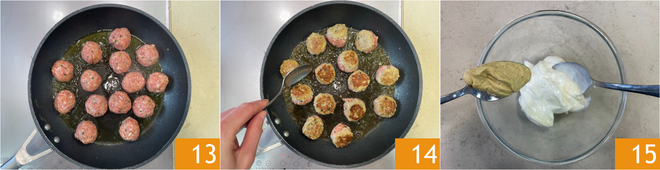 En la misma sartén donde habéis cocido los agretti, verted un poco de aceite y añadid las albóndigas 13. Dorad a fuego medio-alto durante unos 15 minutos, dándoles la vuelta para que se doren por ambos lados 14. Para la salsa de acompañamiento, mezclad la mayonesa con la mostaza de Dijon 15.
