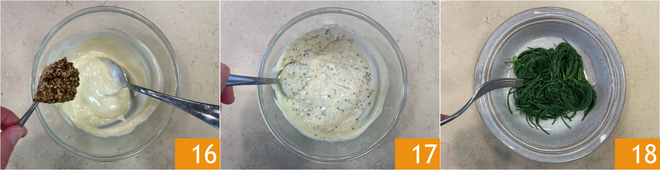 Añadid también la mostaza en grano 16, mezclad 17 y transferid la salsa a una manga pastelera. Emplatad colocando los agretti en el fondo del plato 18.