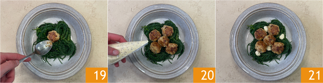 Colocad las albóndigas sobre los agretti 19 y completad con unos toques de salsa 20. ¡Vuestras albóndigas con agretti están listas para ser servidas 21!
