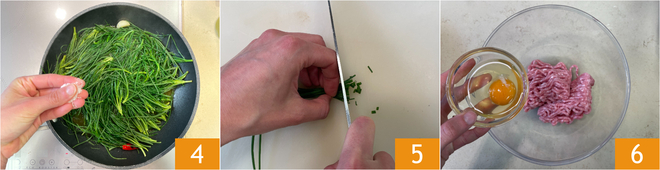 Sazonad 4 y saltead, a fuego medio, durante unos 10 minutos, luego reservad. Ahora dedicáos a las albóndigas: picad finamente el cebollino 5. En un bol, colocad la carne picada de ternera y el huevo 6.