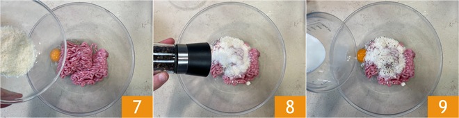 Añadid el Parmesano rallado 7, sal y pimienta 8, luego verted la leche 9.
