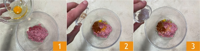 Para preparar las albóndigas con crema de alubias blancas, vierte en un bol la carne picada de ternera y cerdo, luego añade el huevo 1, las especias 2, el chalote y el ajo picados 3.