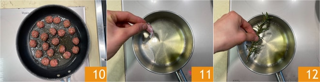 Cocina las albóndigas 10 hasta que estén doradas, dándoles la vuelta de vez en cuando, tardará unos 10 minutos. Mientras tanto, prepara la crema de alubias blancas: en una olla calienta un chorro de aceite con el ajo machacado con piel 11 y el romero 12.