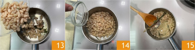 Tan pronto como el aceite esté tibio, añade las alubias blancas que habrás enjuagado previamente 13. Saltéalas brevemente, luego vierte un poco de agua 14 y cocina durante unos diez minutos, el tiempo justo para sazonarlas. Al final de la cocción, elimina el ajo y el romero 15.