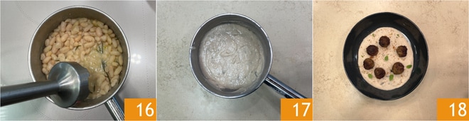Tritura con la batidora de mano 16 para obtener una consistencia cremosa 17. Pasa rápidamente las albóndigas por papel absorbente para eliminar el exceso de aceite, luego colócalas sobre la crema de alubias blancas. Decora con una pizca de cilantro, pimentón y algunas hojas de menta: ¡tus albóndigas con crema de alubias blancas están listas para ser servidas 18!