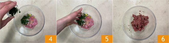 Añade también el perejil y la menta picados 4. Amasa con las manos 5 para integrar la mezcla 6, luego ajusta de sal.