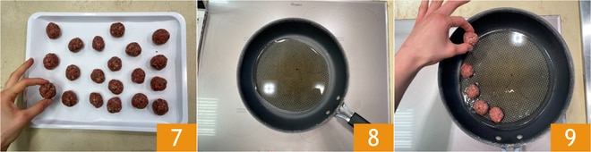Forma albóndigas del tamaño de una nuez y colócalas en una bandeja 7. Calienta el aceite en una sartén 8 y coloca las albóndigas dentro 9.