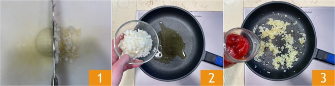 Para preparar las albóndigas en salsa de la abuela, pelad y picad media cebolla 1. En una sartén, verted un chorrito de aceite y la cebolla picada 2. Sofreíd la cebolla durante unos 5 minutos o hasta que esté blanda, luego echad el puré de tomate 3 y salpimentad.