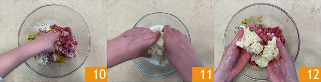 Amasad para mezclar bien 10. Mientras tanto, el pan se habrá ablandado, exprímelo 11 y agrégalo al resto de la mezcla 12.