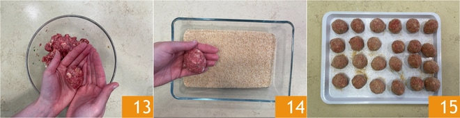 Tomad una parte de la mezcla y formad las albóndigas 13, pasadlas por el pan rallado 14 y colocadlas en una bandeja 15.