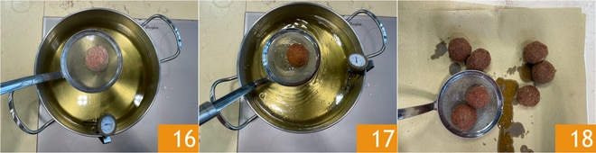 Calentad el aceite de semillas para freír, una vez alcanzados los 170°, sumergid pocas albóndigas a la vez 16 y freíd hasta dorar 17. Escurrid las albóndigas fritas en una bandeja cubierta con papel absorbente 18.