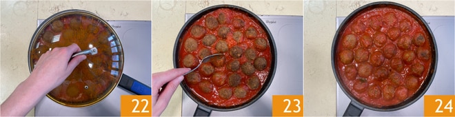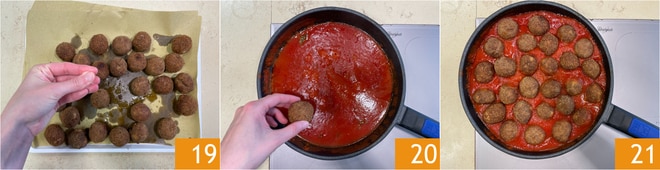 Salad 19 cuando estén aún calientes. Mientras tanto, la salsa estará lista, introducid aquí las albóndigas fritas 20, distribuyéndolas una al lado de la otra 21.