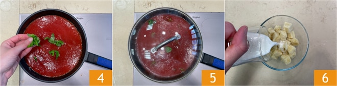 Sazonad con las hojas de albahaca 4, cubrid con tapa 5 y cocinad durante 10-15 minutos. Mientras la salsa se cocina, preparad las albóndigas: en un bol poned a remojo el pan duro con la leche.