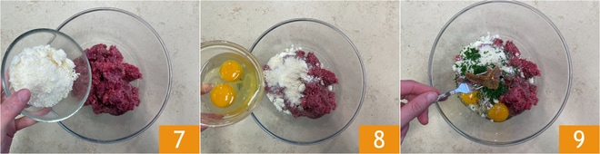 En un bol verted la carne picada, el queso 7, los huevos 8, la sal, el perejil picado y las anchoas 9.