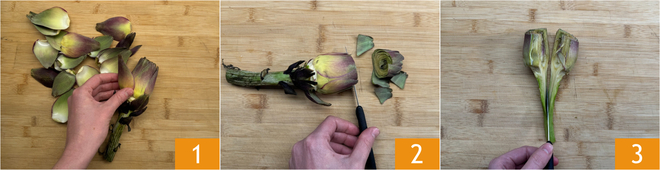 Para preparar las albóndigas de alcachofas con salsa, lo primero que hay que hacer es dedicarse a la Cómo limpiar las alcachofas. Eliminad las hojas exteriores duras 1, luego cortad la punta 2. Pelad el tallo y dividid las alcachofas por la mitad 3.
