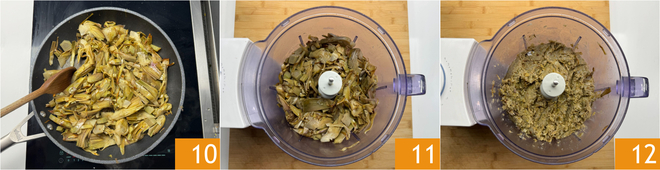 Quitad la tapa y dejad secar durante 4-5 minutos 10, removiendo lo menos posible para que las alcachofas tengan un buen color. Dejarlas templar, podéis quitar el ajo o dejarlo según vuestros gustos. Transferid todo a una batidora 11 y triturad hasta obtener una mezcla homogénea 12.