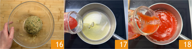 Deberéis obtener una mezcla homogénea 16. Dejad reposar en la nevera durante 1 hora. Mientras tanto, preparad la salsa. En una olla freíd el ajo durante unos minutos, luego añadid el puré de tomate 17 y un poco de agua para enjuagar el recipiente 18.