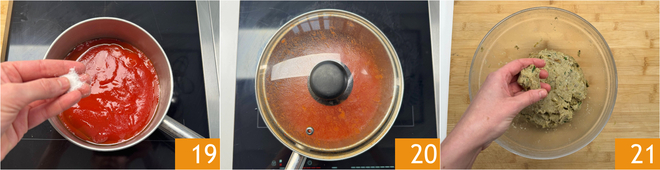 Ajustad de sal 19, cubrid con una tapa 20 y coced durante 15 minutos, removiendo de vez en cuando. Humedeced las manos, formad las albóndigas tomando 20 g de mezcla a la vez 21.