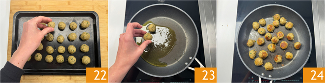 Colocadlas en una bandeja 22. En una sartén antiadherente verted un chorrito de aceite, añadid las albóndigas 23 y doradlas durante 5 minutos, moviendo la sartén para cocinarlas por todos los lados 24.