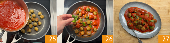 Añadid la salsa 25 y dejad que las albóndigas tomen sabor durante unos minutos. Completad con un poco de albahaca 26 y emplatad. ¡Vuestras albóndigas de alcachofas con salsa están listas para ser disfrutadas 27!