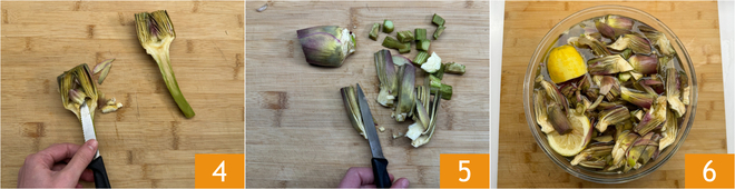 Extraed la pelusa interna 4. Cortad los corazones en gajos y el tallo en rodajas 5. A medida que los limpiáis, sumergidlos en agua acidulada 6, para evitar que se oscurezcan.