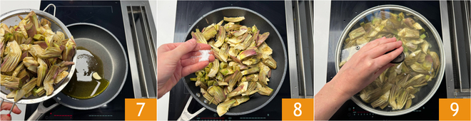 En una sartén verted el aceite, añadid el ajo y freíd durante unos minutos. Agregad las alcachofas bien escurridas 7 y ajustad de sal 8. Mezclad, cubrid con una tapa 9 y coced a fuego medio durante 15 minutos, removiendo de vez en cuando.
