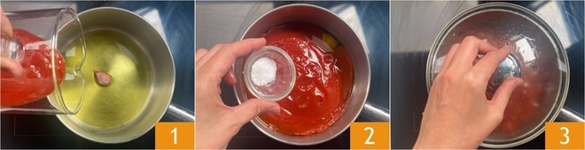 Para preparar las albóndigas de berenjena con salsa, comienza con la salsa de tomate: en un cazo calienta el aceite con un diente de ajo con piel, luego vierte el puré 1 y tanta agua como sea necesario para enjuagar la jarra, luego añade la sal 2. Remueve y cuece con la tapa a fuego lento durante 30-40 minutos 3.