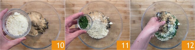 Añade también el Grana Padano DOP rallado 10 y el perejil picado 11, luego ajusta de sal y pimienta. Amasa con las manos para obtener una mezcla suave y compacta 12.
