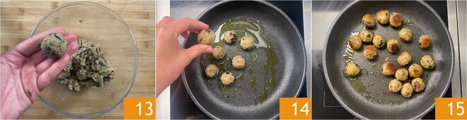 Forma bolitas del tamaño de una nuez aproximadamente; con estas cantidades saldrán unas veinte 13. Para ayudarte, puedes mojarte las manos. Calienta otro poco de aceite en la misma sartén en la que has cocinado las berenjenas, luego coloca las albóndigas 14 y dóralas durante unos 5 minutos, moviendo la sartén para girarlas por todos los lados 15.