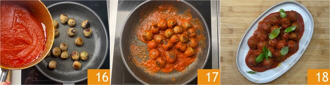 Cuando estén doradas uniformemente, añade la salsa de tomate 16 y saltea brevemente todo para mezclar las albóndigas con el condimento 17. Adorna con hojas de albahaca y sirve tus albóndigas de berenjena con salsa 18.