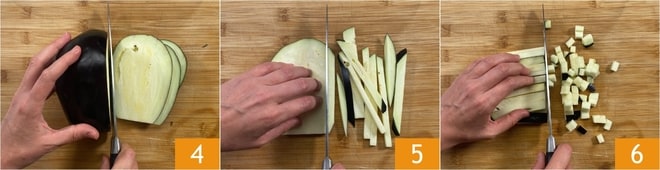 Mientras tanto, prepara las berenjenas: córtalas primero en rodajas 4, luego en bastones 5 y finalmente en cubos 6.