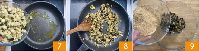 En una sartén antiadherente, sofríe el diente de ajo aplastado con un poco de aceite, luego añade las berenjenas 7 y la sal. Dora las berenjenas a fuego vivo durante unos 10 minutos, removiendo con frecuencia 8. Cuando estén tiernas y doradas, transfiere las berenjenas a un bol y deja enfriar un poco. Una vez tibias, añade el pan rallado 9.