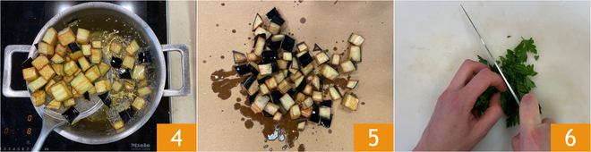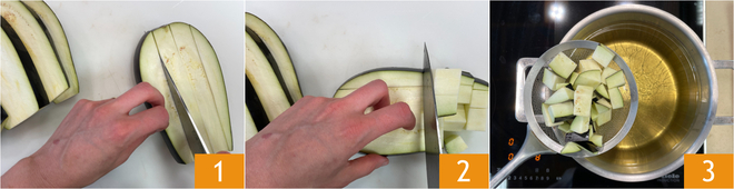 Para preparar las albóndigas de berenjena y atún, primero elimine el pedúnculo de las berenjenas y córtelas primero en rodajas, luego en tiras 1 y finalmente en cubos 3. Fríalas en aceite de semilla de cacahuete a 170°C durante 5 minutos 3. Fría en varias tandas para no bajar la temperatura del aceite.