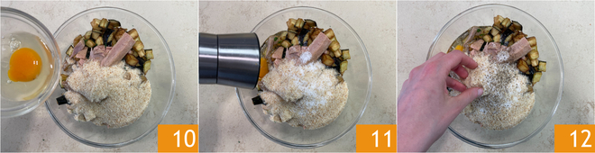 Continúe con los huevos 10 y ajuste de sal y pimienta 11. Amasar 12 hasta obtener una mezcla trabajable y homogénea.