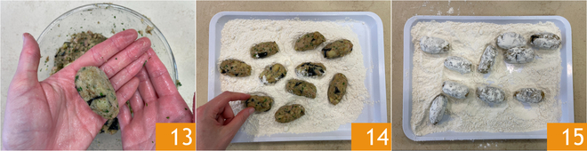 Forme las albóndigas 13, páselas por harina 14 y reserve 15.