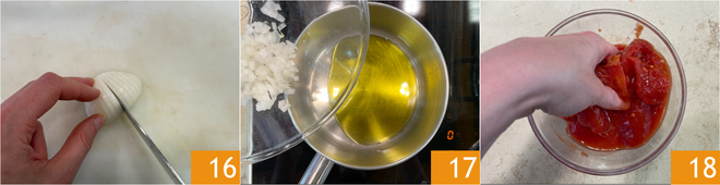 Ahora dedíquese a la preparación de la salsa de tomate. Pique finamente la cebolla 16. Caliente el aceite en una cacerola, añada la cebolla 17 y sofría por unos minutos. Mientras tanto, triture los tomates pelados a mano 18.