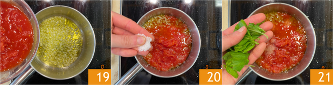 Agréguenlos a la cacerola 19, ajuste de sal 20, añada la albahaca 21 y deje cocinar a fuego medio durante unos 20 minutos.