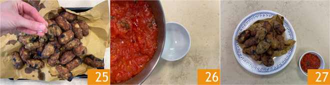 Condimente con sal 25 y sirva. Ponga la salsa de tomate en un bol 26. ¡Sus albóndigas de berenjena y atún están listas para ser disfrutadas calientes 27!