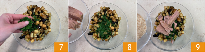 Ponga las berenjenas en un bol, añada el perejil 7, el atún escurrido 8 y el pan rallado 9.