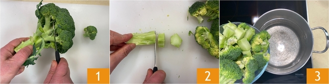 Para preparar las albóndigas de brócoli fritas, empieza por limpiar los brócolis: separa las florecillas 1, luego pela el tallo y córtalo en trozos 2. Pon todo en agua hirviendo 3. <\/p>