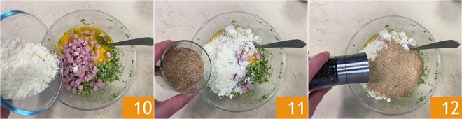 Agrega también el queso rallado 10, el pan rallado 11 y la pimienta 12.<\/p>