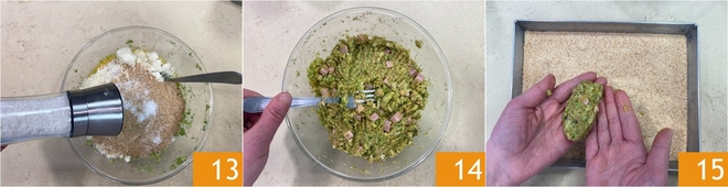 Salpimienta 13 y mezcla para obtener una masa homogénea 14. Toma una porción de masa de aproximadamente 80 g y forma una albóndiga ovalada 15, luego pásala por el pan rallado. <\/p>