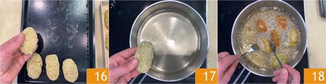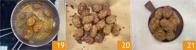 A medida que formas las albóndigas, colócalas en una bandeja; con estas cantidades obtendrás unas 16 16. Calienta el aceite de semillas en una sartén y, cuando haya alcanzado los 170°C, sumerge las albóndigas 17. Cocina durante unos 5-7 minutos, girando las albóndigas durante la fritura 18. <\/p>